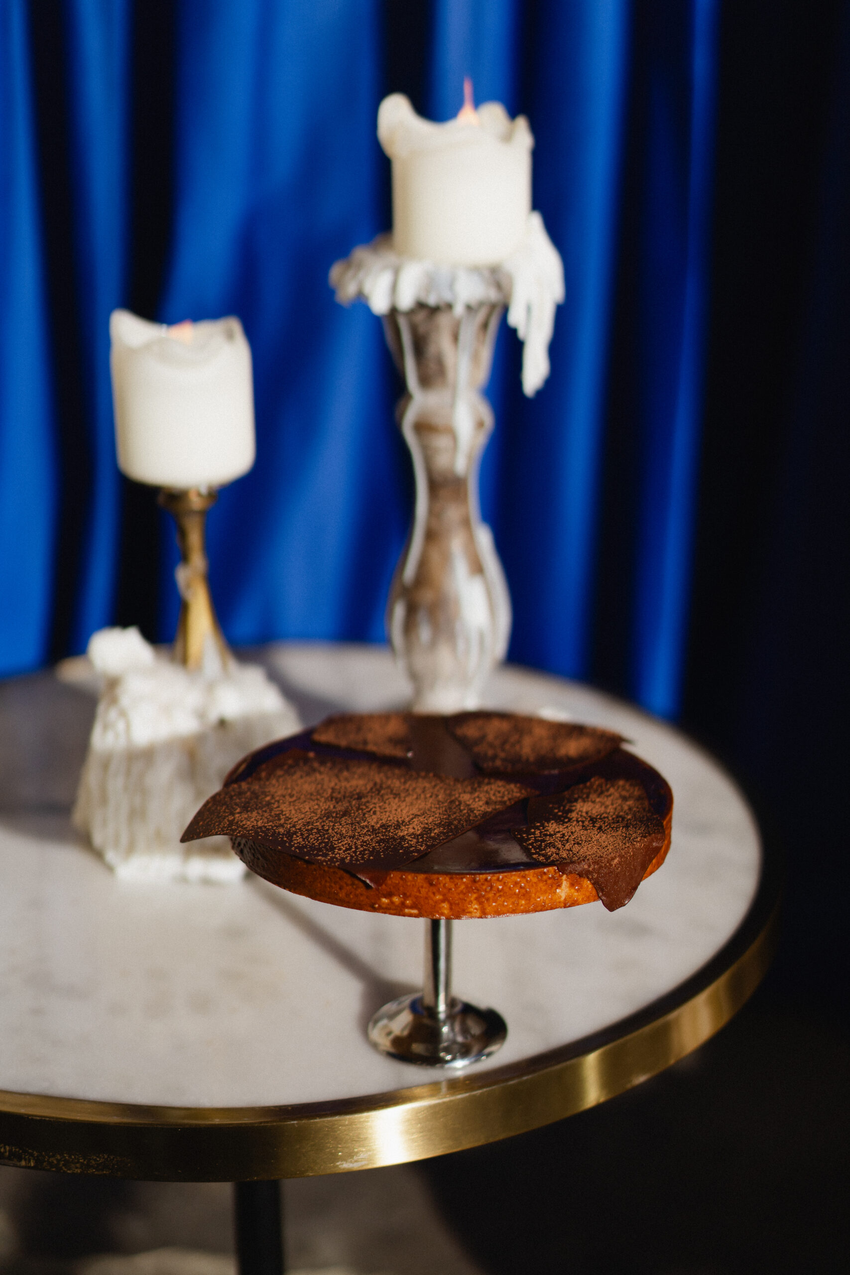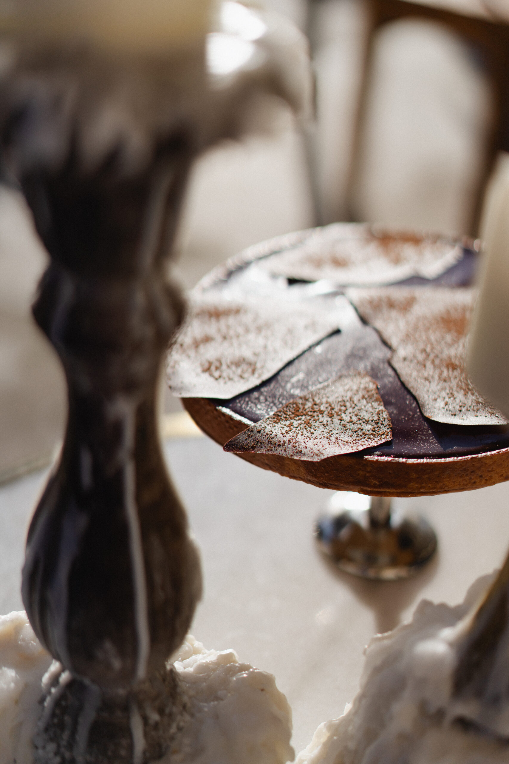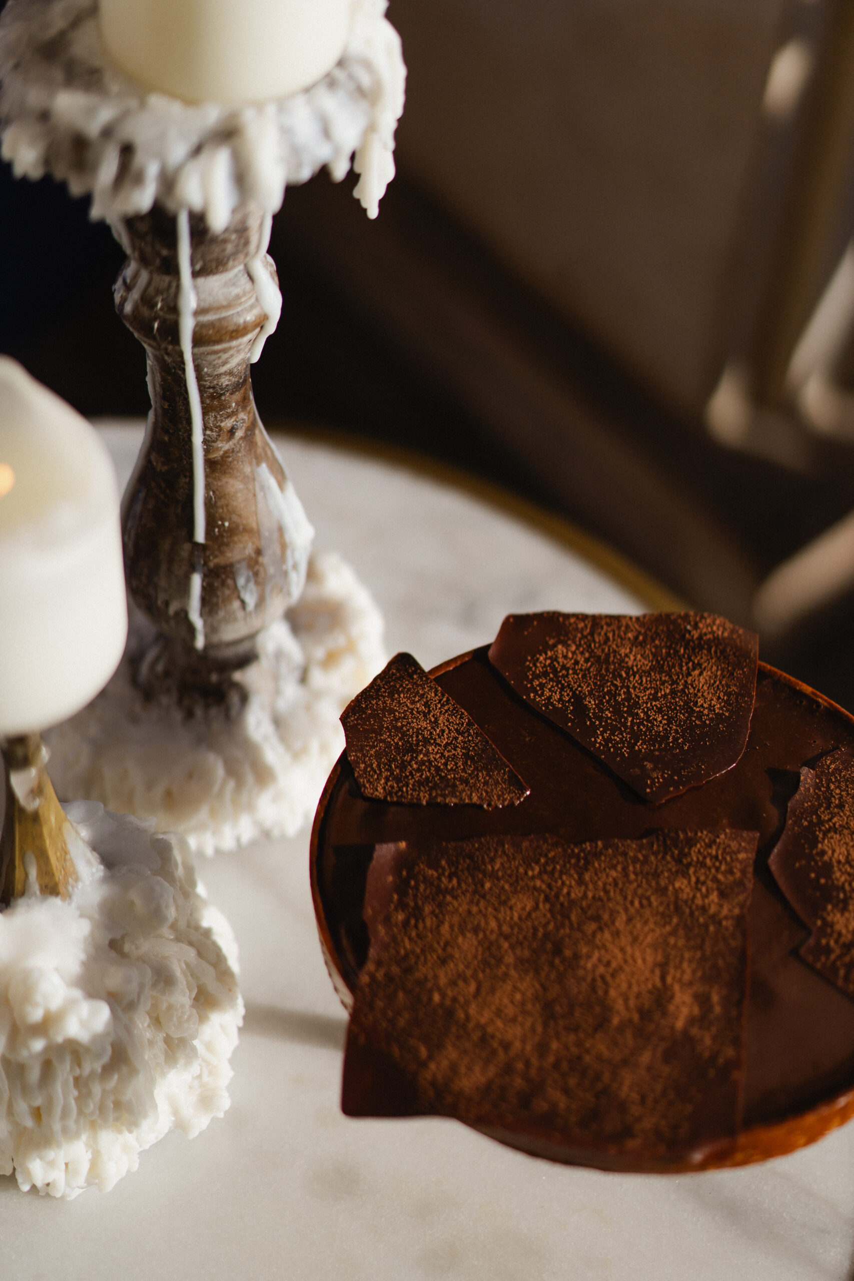 Korzenne, kruche ciasto wypełnione po brzegi konfiturą śliwkową z nutą cynamonu i aksamitnym ganache czekoladowym. Całość udekorowana czekoladą deserową i posypana kakao. średnica 20 cm